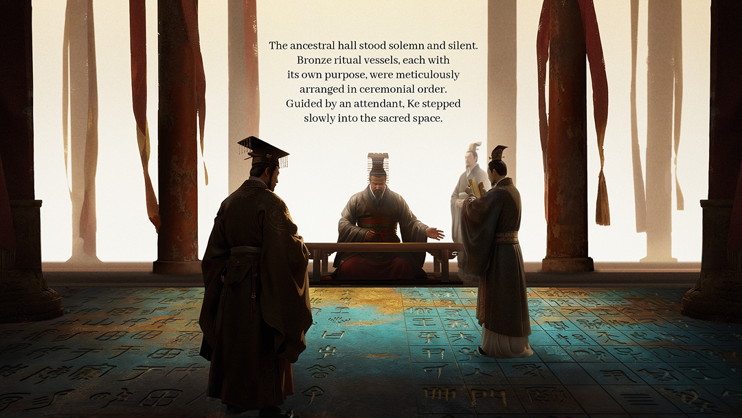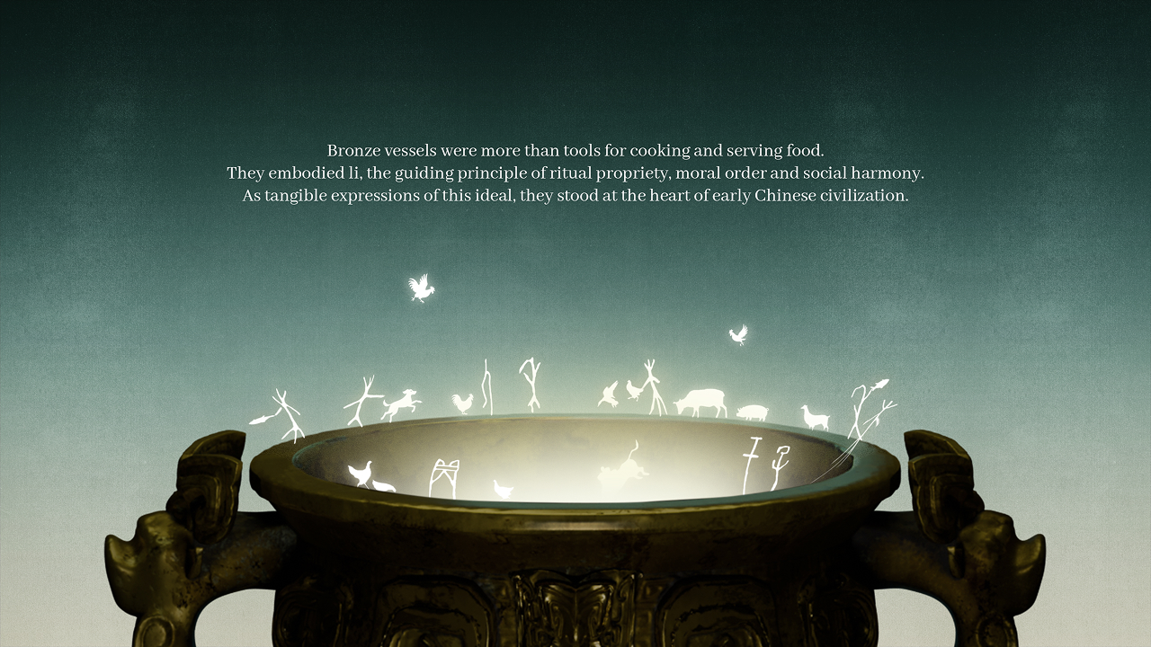 This project is grounded in the historical system of bronze food vessels. By consulting multiple primary sources — oracle bones, bronze inscriptions (jinwen), the ding–gui ritual system, The Rites of Zhou (Zhou Li), the Da Ke Ding inscription, and pre-Qin script evolution — we trace a civilizational chain of “script→system→artifact→personal memory.” We also reviewed museum display strategies and digital heritage cases to determine how immersive narrative, animated visualization, and symbolic structuring can present complex facts so users both understand institutional logic and feel the civilization’s emotional force.