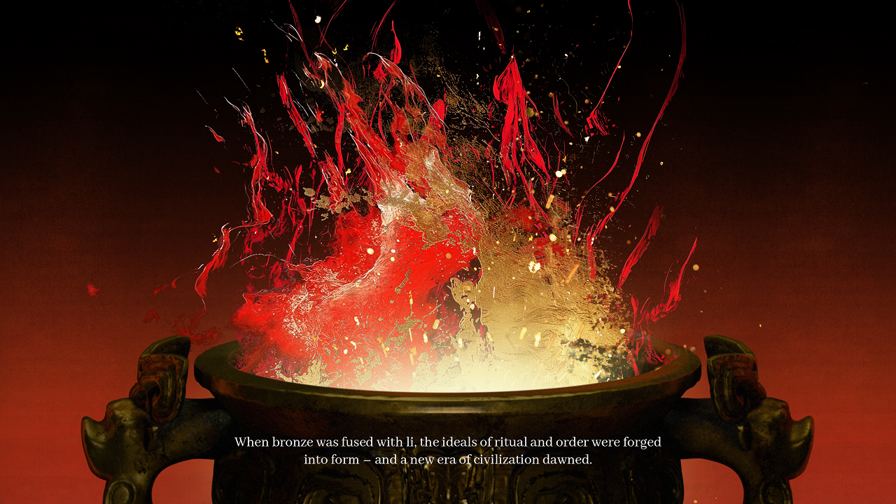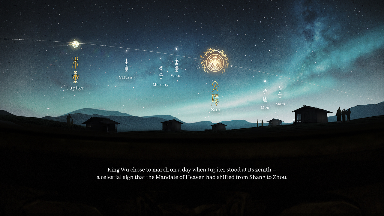 In this section, oracle-bone figures “awaken” from the cattle scapula, crossing fields and offering sacrifices to the heavens before leaping into the Li Gui and transforming into its inscription. The inscription reflects the astronomical event of the Year-Star conjunction, anchoring the historical moment of King Wu’s campaign against Shang and the rise of the Zhou dynasty.