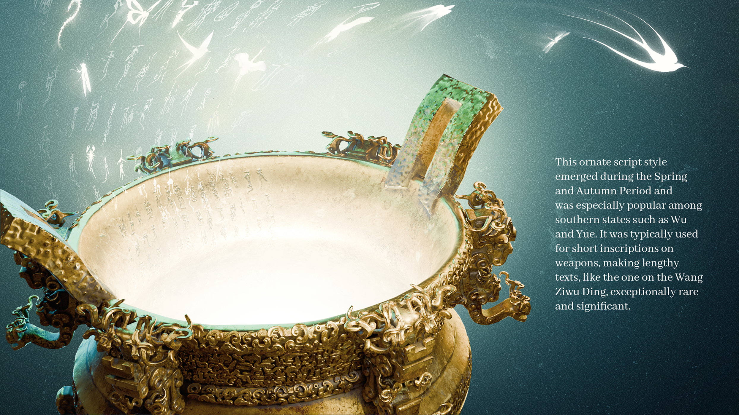 Using the Wang Ziwu Ding as a case study, this section traces pre-Qin script evolution—from simple early Western Zhou inscriptions, through mid-Zhou “heart-shaped” elements, to the ornate Zhongshan and bird-worm scripts of the Warring States. Changes in content reveal how script recorded power, history, and thought, evolving from pictographs into expressive, aesthetic forms.