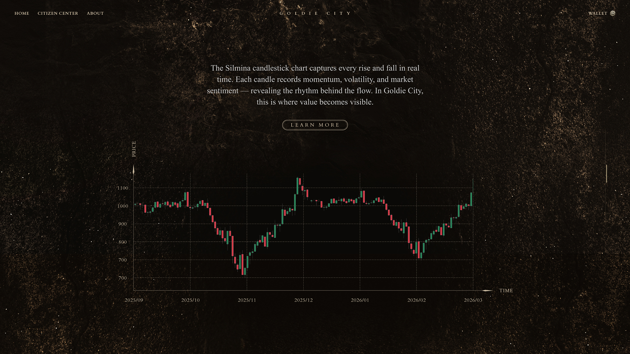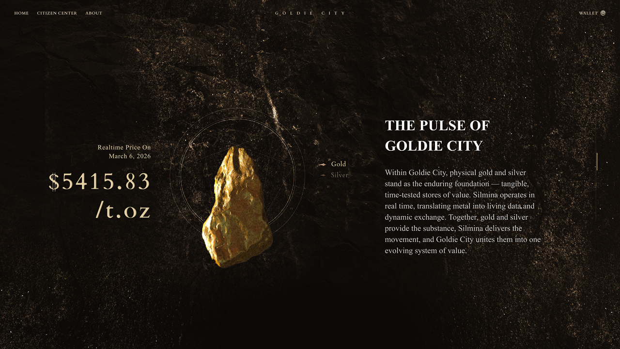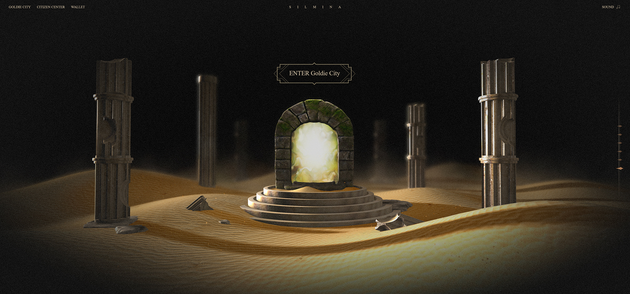 Entering through a hidden passage from the homepage, users arrive in a mysterious landscape. As the camera moves across a barren desert, a golden city—powered by silver extraction and mechanical systems—gradually emerges. The scene culminates in a fully constructed hero view introducing Goldie City. Scrolling further, users descend underground, where information is revealed as if excavated: real-time gold and silver prices, SilMina’s market chart, and Q&A content presented on ancient parchment.