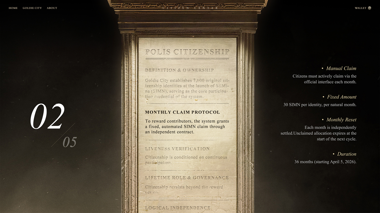 This page takes the form of a civic hall, presenting the citizenship system and enabling the core action of monthly SIMN claiming. Users interact with a central silver pool to claim their monthly allocation, turning abstract rules into tangible actions. As they scroll, a monumental stone tablet reveals the citizenship rules line by line, accompanied by contextual explanations. The experience concludes with an entry point to “Become a Citizen,” guiding users from understanding to participation.