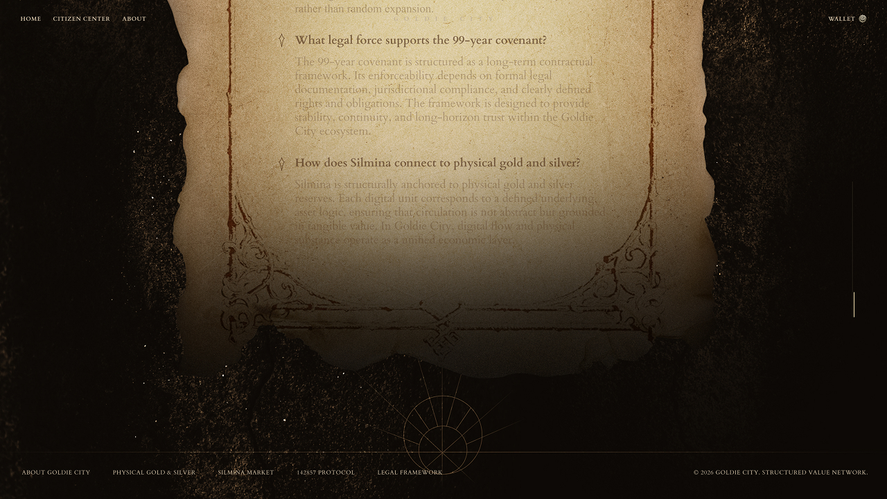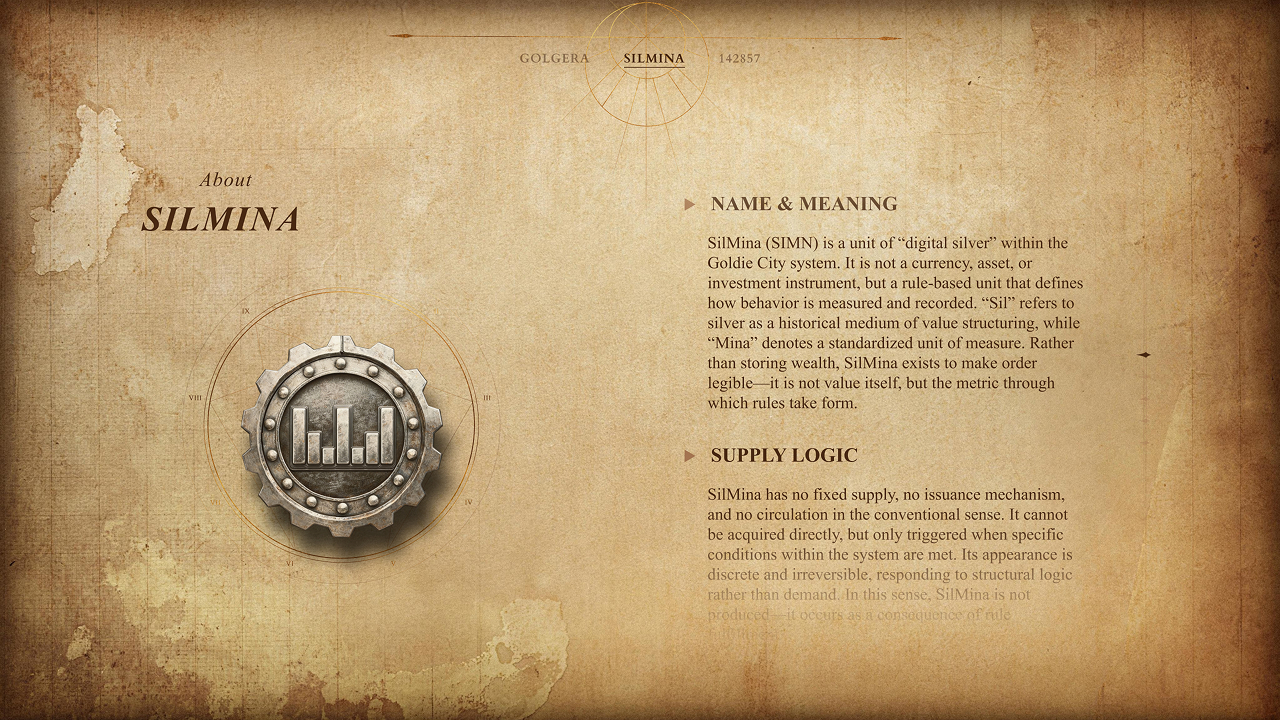 SilMina (SIMN) is a “digital silver” unit within the Goldie City system. It is not an asset or financial instrument, but a rule-based institutional unit. Goldie City is a decentralized, blockchain-based order that does not create or hold assets; instead, it provides a framework for the digital attribution and circulation of real-world value.