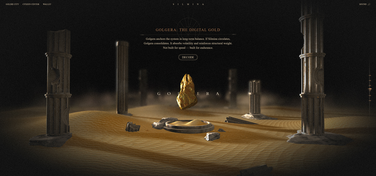 The homepage uses 3D web technology to construct an explorable digital ruin. Users navigate the space through scroll-driven camera movement, gradually uncovering the system’s structure and rules. Key concepts—including time logic, the nature of SilMina, GolGera’s role, and the “142857 Protocol”—are embedded along this journey. The experience resembles an archaeological exploration, where knowledge is discovered rather than presented.