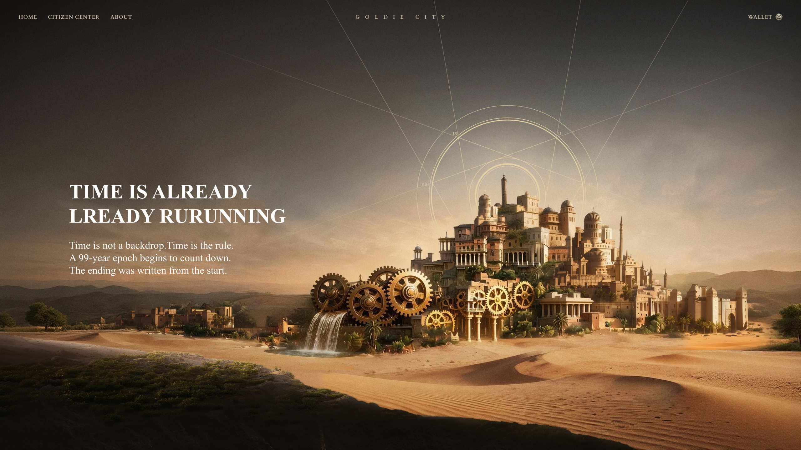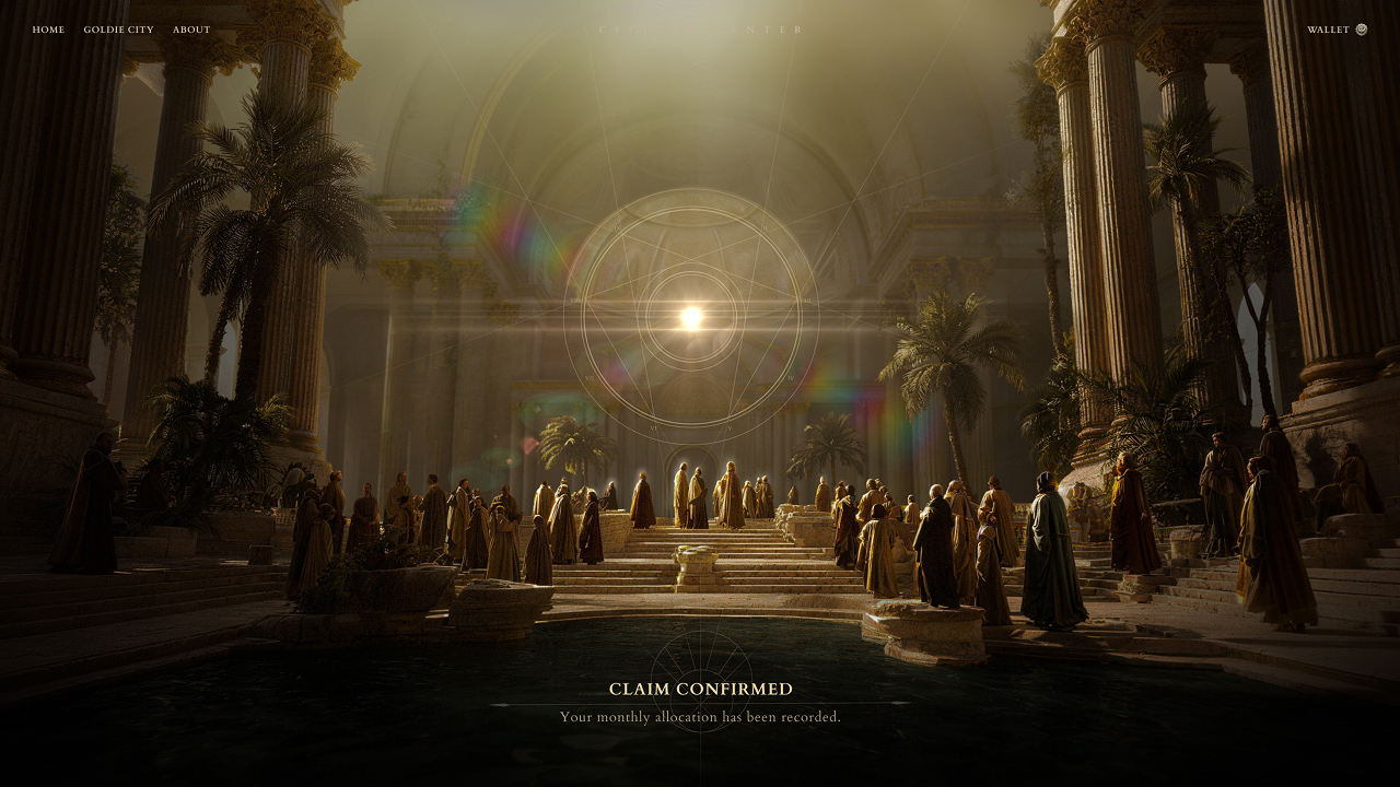 This NFT is designed as a proof of citizenship within Goldie City, serving as a digital embodiment of identity and system logic. The form follows a metallic medallion, with a brushed silver outer ring engraved with “GOLDIE CITIZEN” and “In Service of the Realm,” conveying order, responsibility, and belonging. At its core, a high-relief “Golden City” represents the decentralized polis, while embedded mechanical gears reference the 99-year temporal system and its rule-driven operation. The overall aesthetic emphasizes weight and historical depth, positioning the NFT as both an identity marker and a material expression of the system.